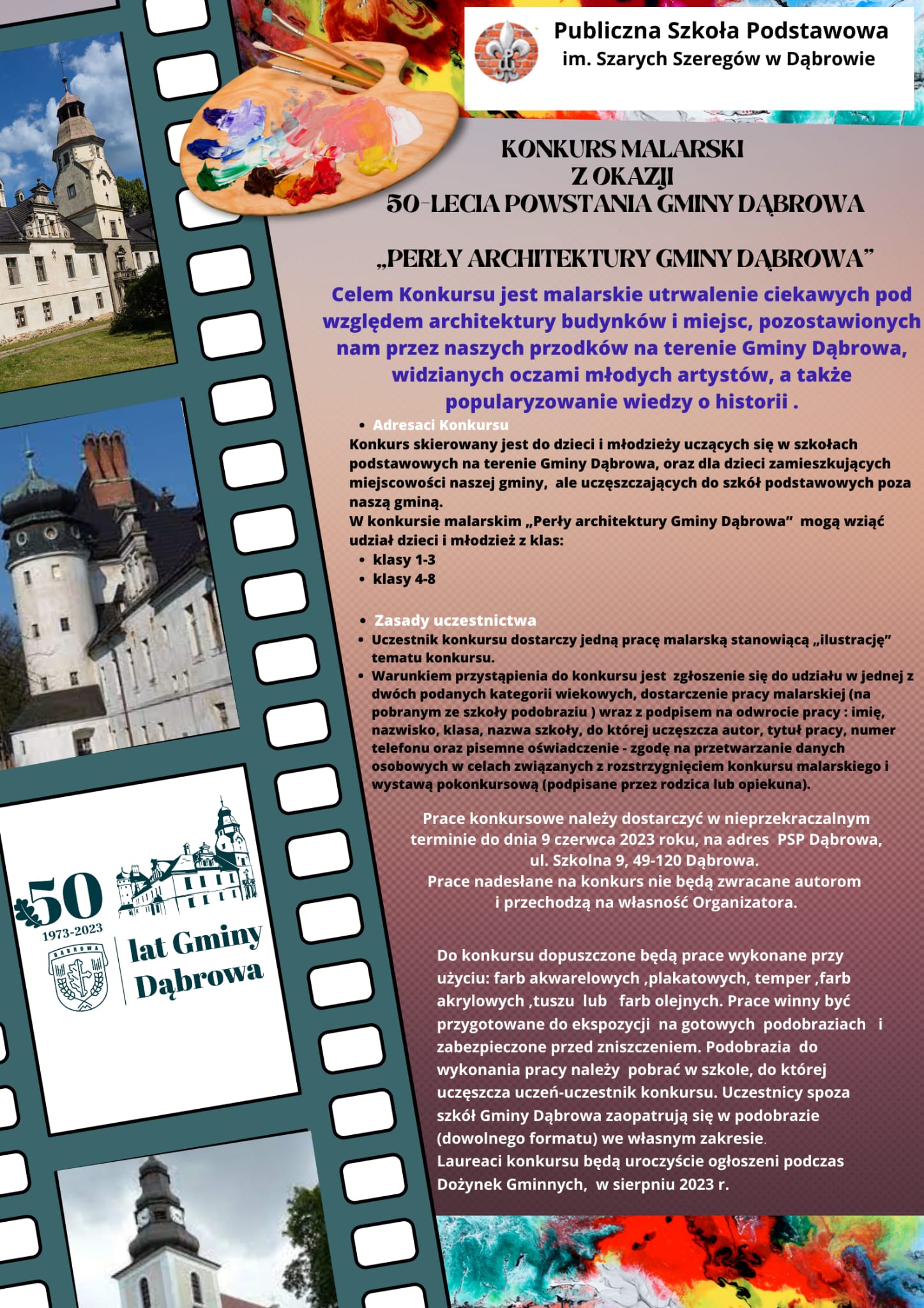 24 kwietnia, 202324 kwietnia, 2023Aktualności, Komunikaty Konkurs malarski – „Perły architektury Gminy Dąbrowa”. Koordynator w PSP W CHRÓŚCINIE: Pani Aleksandra Homenda Regulamin konkursu malarskiego- „Perły architektury Gminy Dąbrowa” (klik)